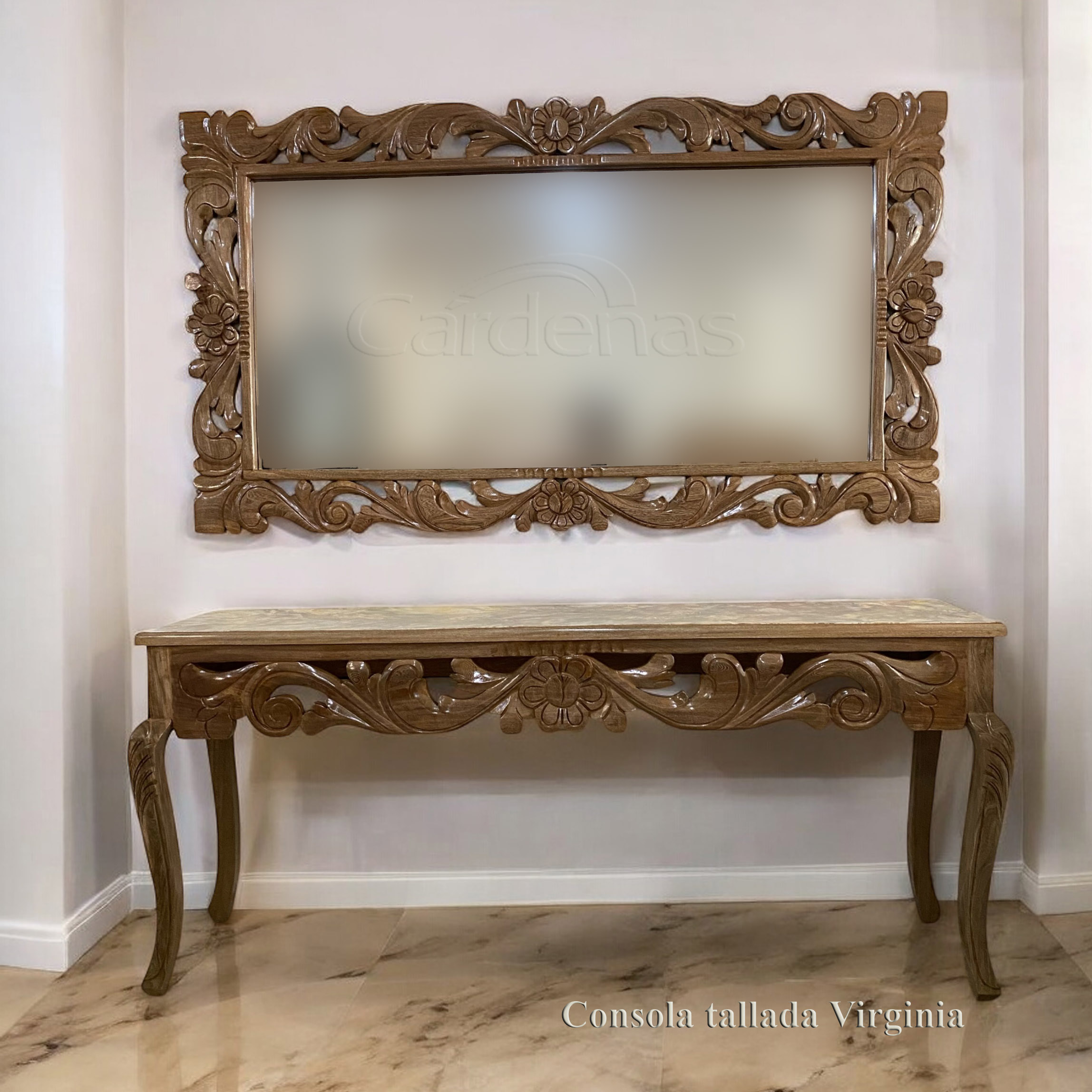 Marco tallado de roble con espejo y Mueble multifuncional con 3 gavetas